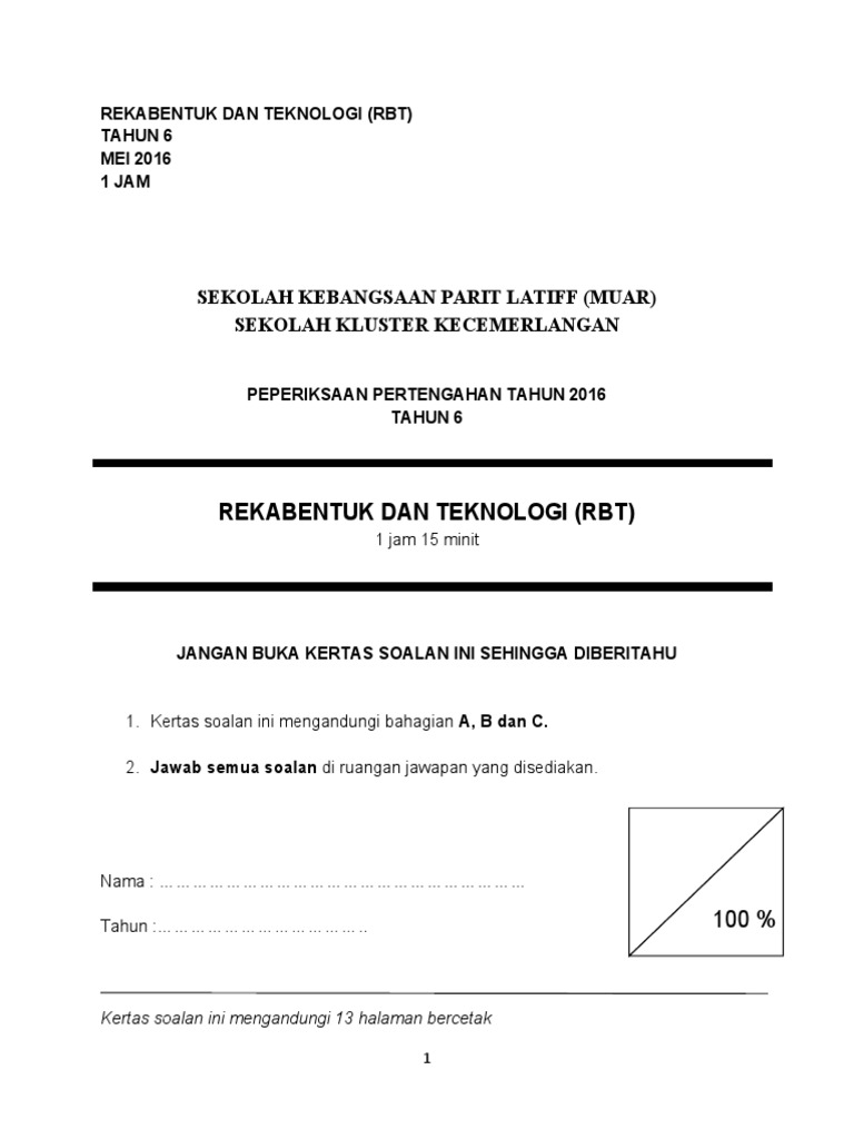 Soalan Peperiksaan Rbt Mei 2016 - Tahun 6 Sk Pt Latiff PDF
