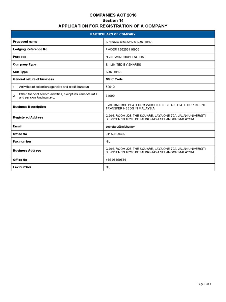 Spenmo Malaysia - Draft Incorporation PDF Malaysia Business