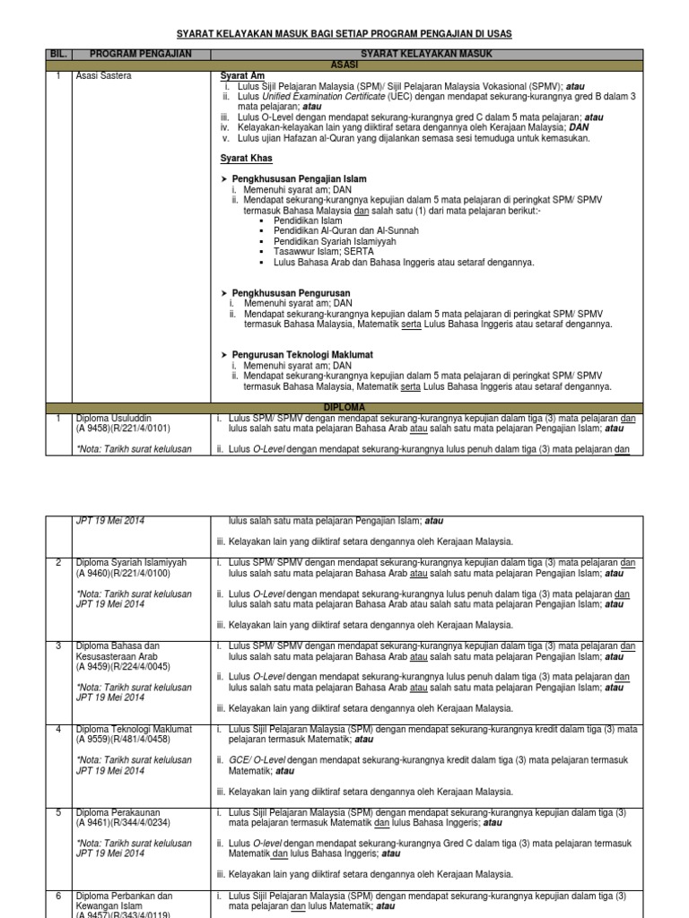 Syarat Kelayakan Masuk Bagi Setiap Program Pengajian Di USAS